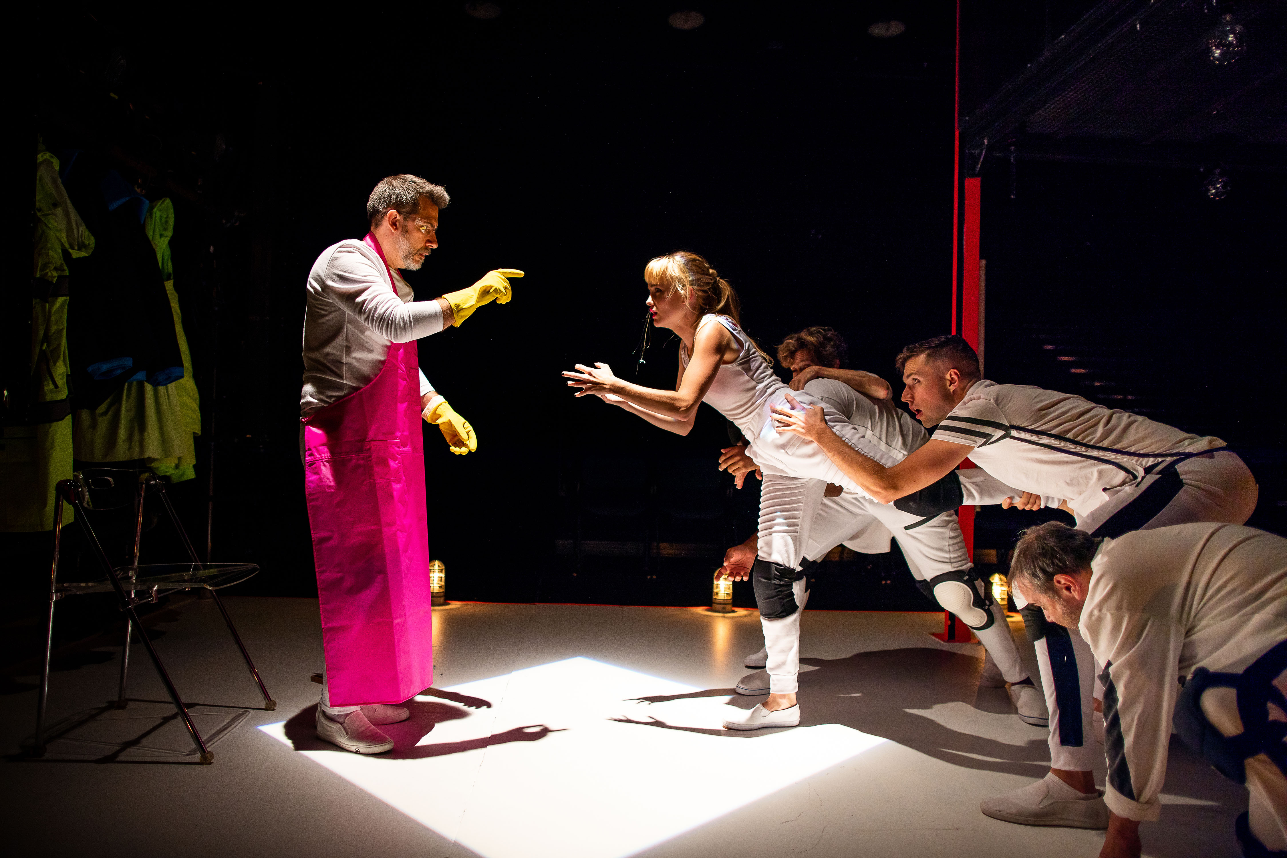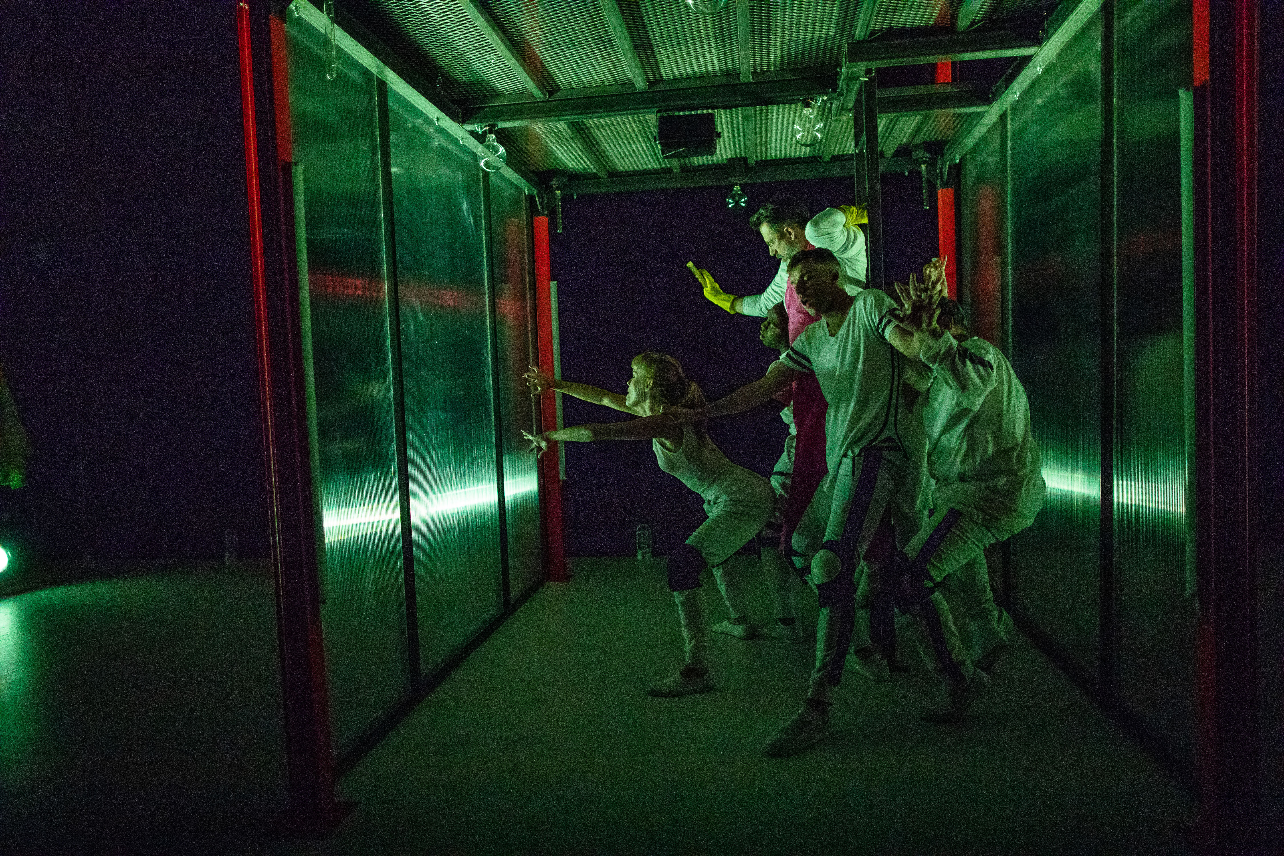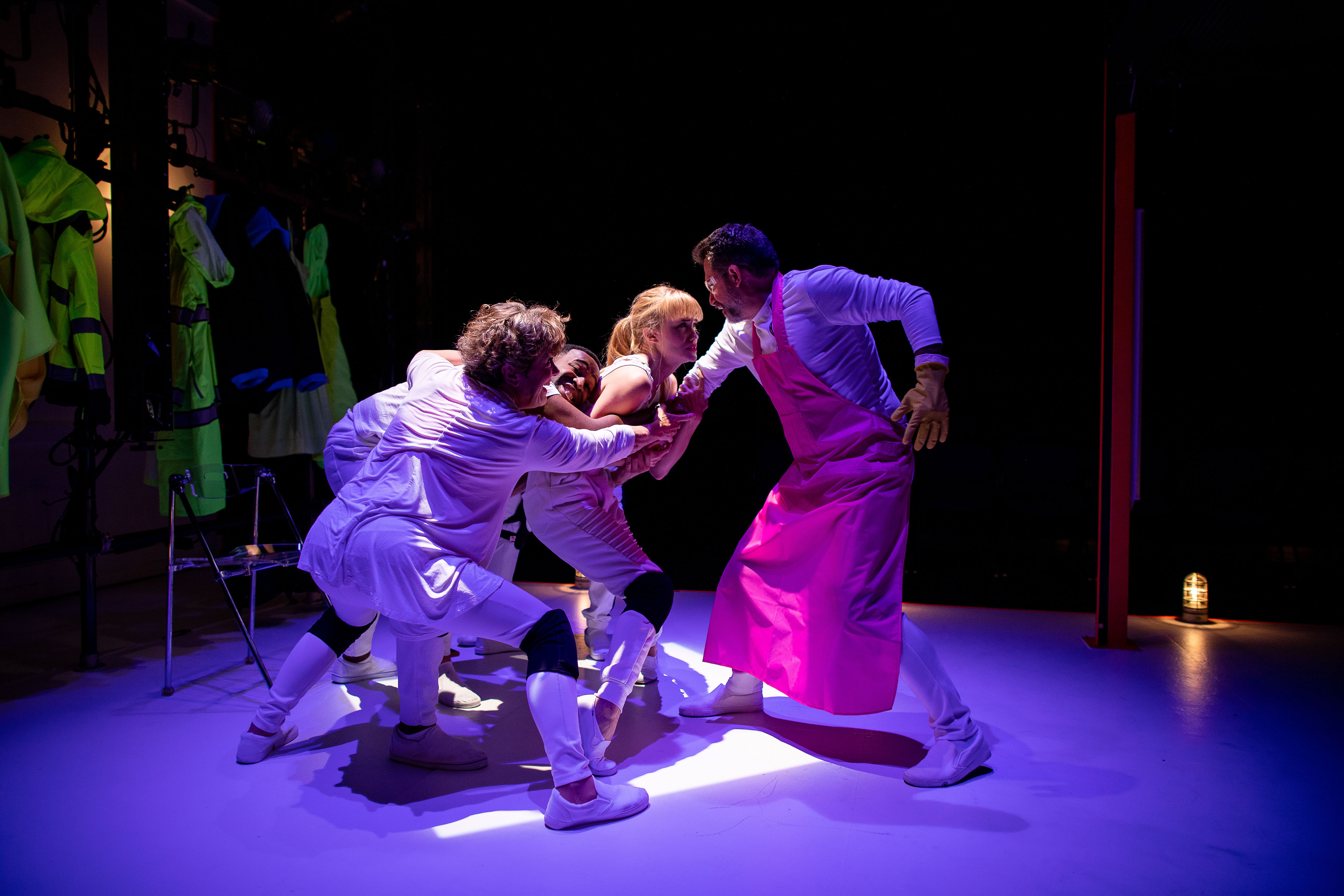 (Clockwise from left): Ashley Risteen, David Keohane, John Kuntz, Debra Wise, and Omar Robinson in FRANKENSTEIN. Photo: Nile Scott Studios.